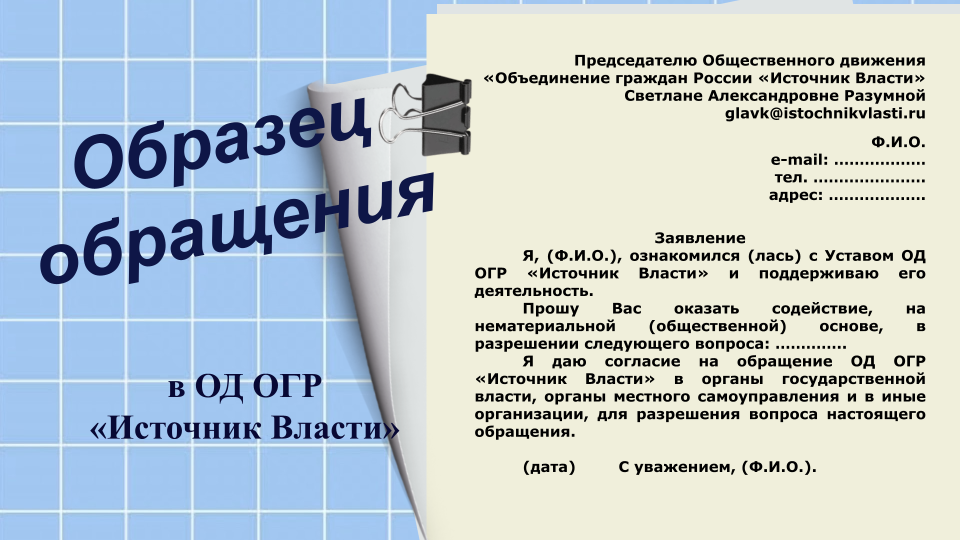 Образец обращения на имя председателя ОД ОГР "Источник Власти"