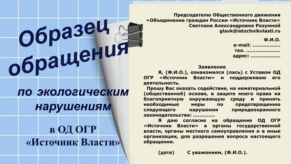 Образец обращения на имя председателя ОД ОГР "Источник Власти" по вопросам экологических нарушений